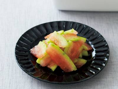 すいかの皮を薄切りにして、歯ごたえのよい浅漬けに。果肉の赤いところを少しだけ残すと見た目もきれいで、風味もよし。