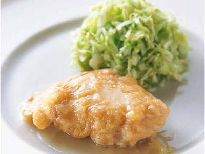 鶏肉は油でカリッと焼き色をつけて、香ばしさで満足感がえられ、塩分ダウン。キャベツはゴマの風味で塩分控えめに。