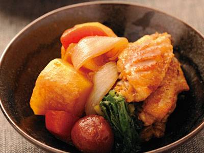 鶏手羽のうまみと大きめに切った3種の野菜とが溶け合って、ご飯がすすみます。
