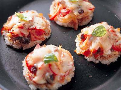 ご飯を丸く焼いて具をのせれば、おやつにもちょうどいいピザに。冷めたものもおいしい!