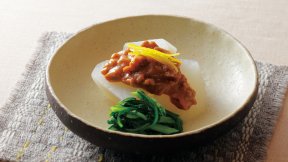 だしではなく水でゆで、大根本来のうまみを楽しむ一品。香ばしいみその風味とシャキッとみずみずしい春菊がよく合います。