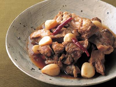 スペアリブは骨からホロリと身がはずれるほど柔らか!にんにくは栗(くり)のようにホクホクの煮上がりに。
