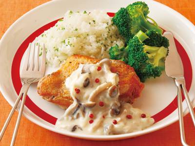 電子レンジでチンするだけのきのこのホワイトソースを鶏のソテーにかけた一皿。パンやパスタに合わせても。