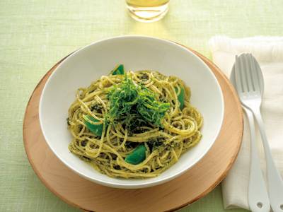 ジェノベーゼ?いえいえ、青じそを使ったしそ・ベーゼです!ジェノベーゼよりもさっぱり食べられ、仕上げの青じその香りとスナップえんどうの食感が季節感を際立たせています。