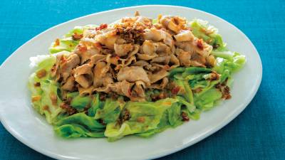 イメージは、キャベツ畑の真ん中で眠る豚さん。まろやかで香ばしいピリ辛だれで、ゆでたお肉と野菜がモリモリ食べられます。