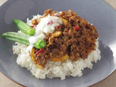 レモンを丸ごときかせたドライカレー。酸味とピリッとした辛みが絶妙のバランスです。まったりとしてちょっと辛いヨーグルトチリソースをかけると、さらに味がまとまりますよ。