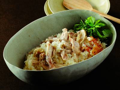 フワーッとしょうがが香りたつ絶品ピラフ。鶏肉の脂やうまみと合わさると、しょうがの辛みがとんで食べやすくなります。お餅を加えて炊くので、もっちりおこわ風です。