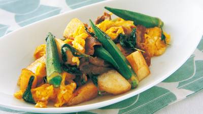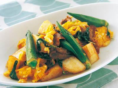 3種類のネバネバ野菜をたっぷり使い、豚肉と卵でいためた一品。ボリュームたっぷりで栄養満点です。