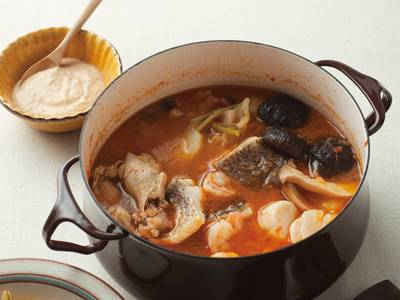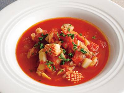 先に野菜を炒めて火を通しておくことで、煮込み時間を短縮。にんにく風味のアイヨリソースがシーフードのうまみとトマトのフレッシュな酸味を引き立てます。