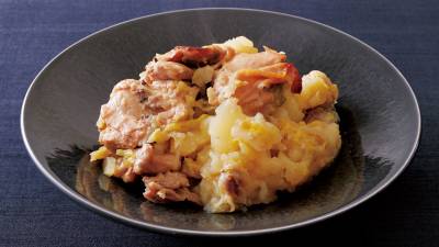 フランス北東部・アルザス地方の郷土料理【ベックオフ】の日本の冬野菜アレンジ。白菜やじゃがいもに白ワインでマリネした肉のうまみを吸わせます。