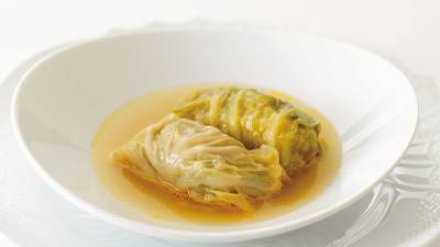 煮込み料理の代表のロールキャベツ。柔らかい肉と甘いキャベツとが混然一体のおいしさです。
