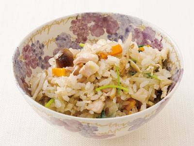 根菜やきのこが入ってにぎやかな炊き込みごはん。米はあらかじめ吸水させ、具は煮てから合わせて炊く方法がおすすめです。