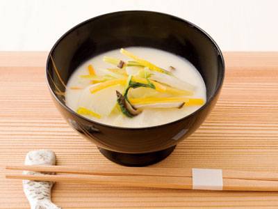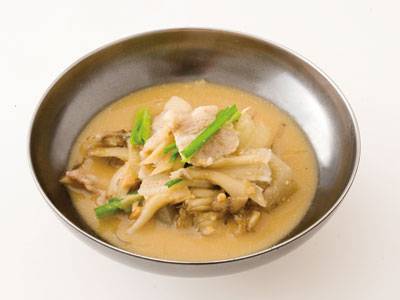 練りごまで香りを出し、にらの風味をきかせた個性的な豚汁。辛口のみそにみりんを加えることで甘みとコクが生まれます。