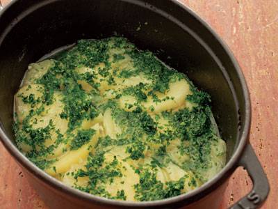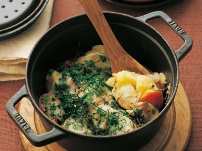 厚手の鍋でじゃがいも・たまねぎ・にんじんを蒸し煮に。豚バラとたっぷりのハーブをのせて仕上げます。