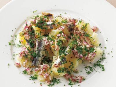 新じゃがいもがたまらないおいしさ。フレンチドレッシングにたまねぎ・パセリ・ケイパーなどを加えた「ラビゴットソース」で召し上がれ。