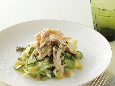 田代さんの懐かしの味を洋風にアレンジ。春キャベツときゅうり、青じそを塩でもんだシンプルなサラダにささ身を加えてボリュームアップ。ドレッシングのマーマレードジャムがアクセント。