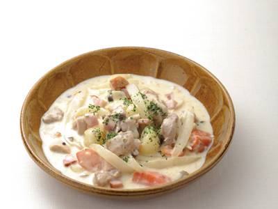 材料を下ゆですると時間短縮につながります。一口食べて思わず「うまい!」と声が出るクリームシチューですよ。