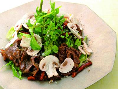 牛肉のカリカリの食感とカレー風味のつけだれで野菜をもりもり食べられます。葉野菜は少し苦みのあるものがあれば、よく合います。
