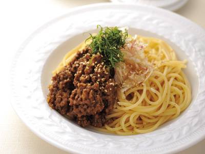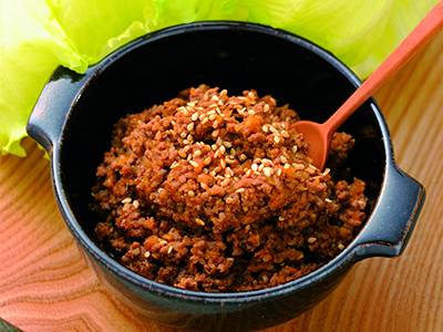 ヨーグルトやウスターソースでコクを加えたそぼろは、くせになるおいしさです。しっかり味のわりにさっぱりしているのは、使う油が少ないから。よく混ぜていただきましょう。
