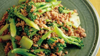 ひき肉をよく炒めてうまみを引き出し、ブロッコリーにたっぷりからめていただきます。