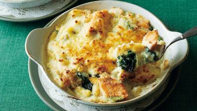 彩りきれいな具材とソースをフライパンひとつで手軽に仕上げるグラタンです。極意は小麦粉の炒め方に!焦らずじっくりと炒めて、なめらかなソースをつくりましょう。