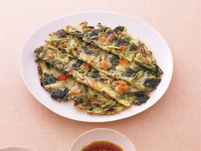 みつばとアスパラガスの香りがいい春のチヂミです。表面をカリッと焼くのがポイント!