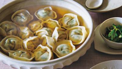 青菜をたっぷり入れた水ギョーザを煮干しのだしでいただきます。小松菜のほか、香りのよい春菊やせりでつくるのもおすすめ。