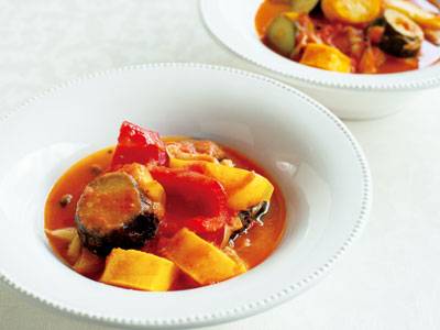トマトやズッキーニから出た水分は、どんなソースにも負けないほどのおいしさです。生ハムの塩けがアクセントに!