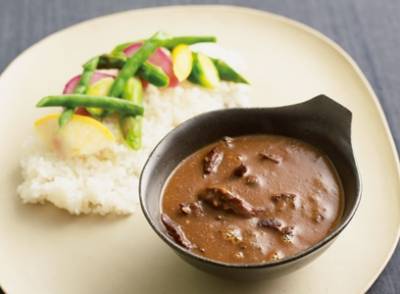 牛すじ肉をカリッカリに焼いてから煮込み、スパイスとルーのダブル使いで仕上げるカレー。牛すじ肉のコリコリとした食感を楽しみます。マイルドなカレーですが、辛いものが苦手な人は、はちみつなどを足すとさらにおいしく食べられます。