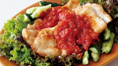 下ごしらえは包丁いらず。たたいて、ちぎって、すりおろすだけ。揚げ焼きした鶏むね肉とたたききゅうりに、すりおろしたトマトのたれをからめてさっぱりといただきます。