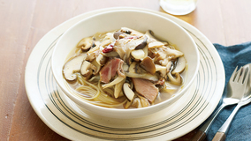 きのこをこんがりと炒めたら、だしを加えてきのこのエキスを煮汁に移すのがおいしさの秘けつ。