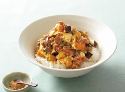 マーボー豆腐とマーボーなすを、一度に味うことのできるぜいたく丼。甜麺醤(テンメンジャン)は使わずに、みそでおいしくできるレシピです。