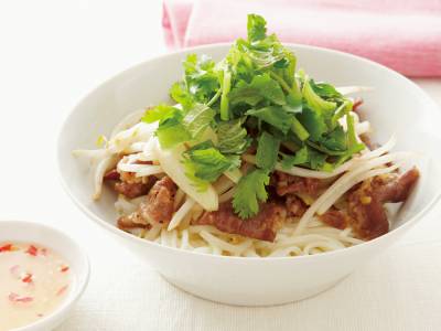 ベトナムの麺・ブンの代わりに、おなじみの冷や麦を使ったあえ麺。下味をつけた豚肉と野菜を炒めてのせ、甘酸っぱいたれ「ニョクチャム」をかけて召し上がれ。