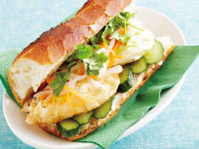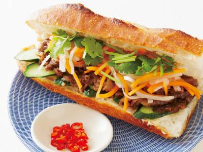 「バインミー」とはベトナム語でフランスパンのこと。バターの代わりにクリームチーズを塗り、なますをはさみます。二つの酸味が効いて、食べ応えはあるけれどさっぱりしたおいしさ。