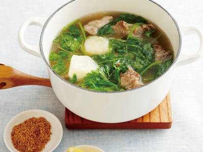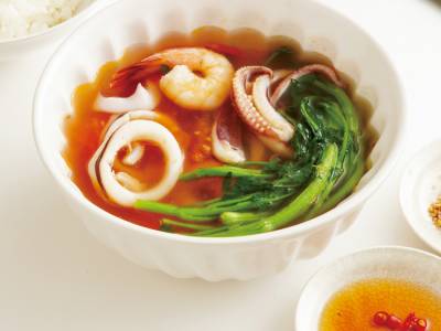 魚介、トマトのうまみに干しえびも加わった、味わい豊かなスープです。クレソンはフレッシュ感を残し、「ごま砂糖塩」をつけておひたし感覚で。