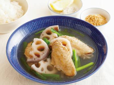焼きつけた鶏手羽中は、骨までいいだしになります。塩、黒こしょう、レモンを合わせたものにつけながら食べれば、味にメリハリが出ます。