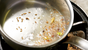 油で熱したスパイスを油ごとカレーの仕上げに加える技法を、テンパリングと呼びます。スパイスの香りを強く引き立てたいときに、ぜひどうぞ。