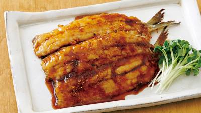 下処理してあるいわしを使えば、かば焼きも簡単です。かたくり粉をまぶして焼くので、たれがからんで、よくなじみます。