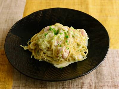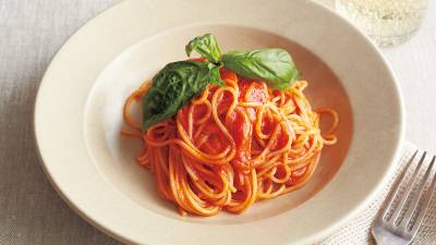 落合流は、炒めるのは具だけ。パルメザンチーズでコクをつけた、甘酸っぱいケチャップソースにパスタをからめます。トロッとした口当たりのナポリタンです。