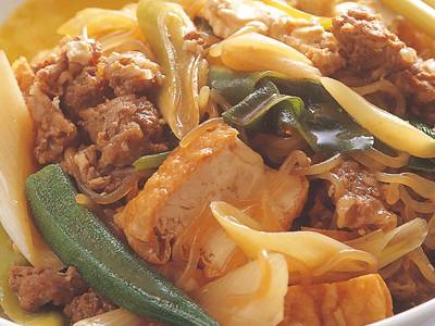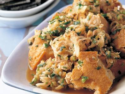 焼いた厚揚げをチャポンとつけ汁に入れるだけの簡単メニュー。薬味たっぷり、パリパリのりで巻いて食べるのがカツ代流。