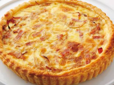 ベーコンとたまねぎ入りの定番お食事キッシュ。冷凍パイシートを使ってつくります。たまねぎをしっかり炒めて甘みを出すのがコツです。