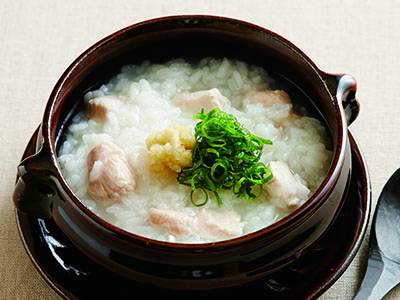 おかゆは消化がよく、口当たりがやさしい理想的な朝ごはん。鶏ささ身が入っているので、食べごたえも十分です。