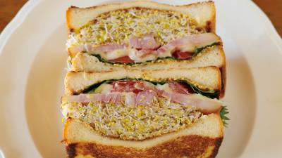 こんがり焼いた食パンで、大量のスプラウト、ベーコン、チーズ、トマト、青じそをギュッと押しつぶすようにサンド。切り口のボリューム感と色鮮やかさ、そして、おいしさは絶品!