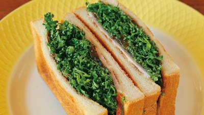食パンは両面をトーストしてバターを塗ります。ハムの塩けとマーマレードの甘酸っぱさ、パセリの香りが相性ぴったり。驚くほどたっぷりのパセリが食べられます。