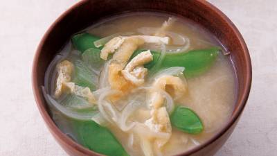 スナップえんどうとたまねぎのミルクみそ汁