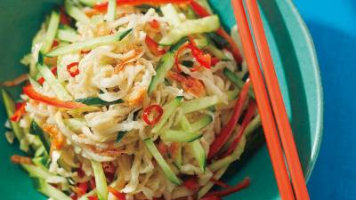 青いパパイヤでつくるタイのサラダ「ソムタム」を、切り干し大根でアレンジしたレシピ。切り干し大根は熱いドレッシングで戻すので、ドレッシングがよくしみて食感もアップします。