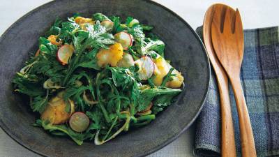 春菊とマスタードが好相性。バターとにんにくの香りが食欲をそそる一品です。