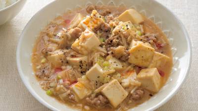 和風の調味料とラー油で、ひと味違うマーボーが完成!えのきだけのうまみで深い味わいになります。