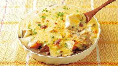出雲地方で、古くから神事の際にふるまわれ、食べられてきた小豆をかぼちゃと合わせました。小豆とかぼちゃの自然な甘みをいかした、和風グラタンです。