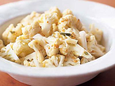 アツアツのマリネ液をカリフラワーにジュッと。ブロッコリのようなコリッとした食感とマスタードシードが味の決め手です。